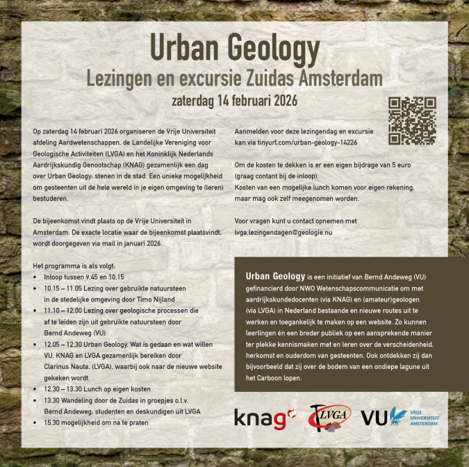 Op zaterdag 14 februari 2026 organiseren de Vrije Universiteit afdeling Aardwetenschappen, de Landelijke Vereniging voor Geologische Activiteiten (LVGA) en het Koninklijk Nederlands Aardrijkskundig Genootschap (KNAG) gezamenlijk een dag over Urban Geology: stenen in de stad. Een unieke mogelijkheid om gesteenten uit de hele wereld in je eigen omgeving te (leren) bestuderen.