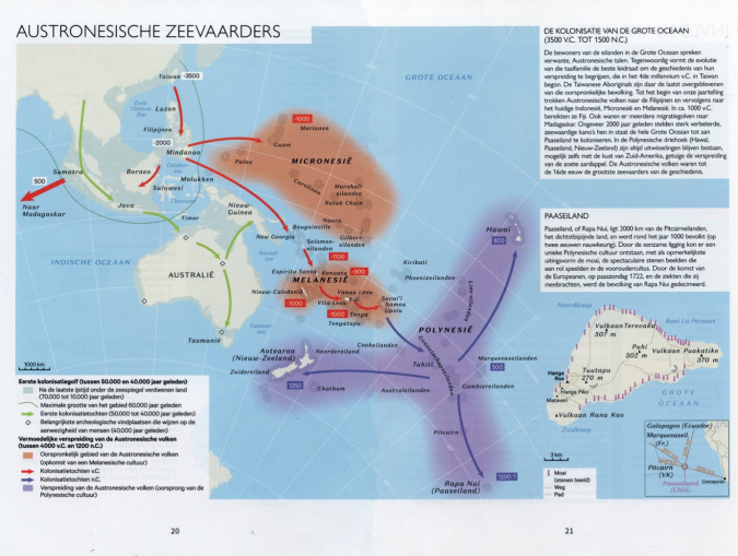 Dit boek is eigenlijk een heel uitgebreide uiteenzetting van hoe de wereld steeds meer geglobaliseerd is geraakt. Op verschillende plekken ontwikkelden groepen mensen samenlevingen, die in de loop der tijd sterk met elkaar verbonden raakten. De locaties van die samenlevingen hadden grote invloed op de ontwikkeling ervan. Bijvoorbeeld vanwege het klimaat, de natuurlijke omgeving, mogelijkheden voor landbouw, de aanwezigheid van dieren. De fysieke afstand speelde uiteraard een belangrijke rol in de mate van verbondenheid tussen diverse groepen. Logisch dat op afgelegen eilanden mensen het langst geïsoleerd bleven leven, zoals de Aboriginals in Australië. Dat land werd pas begin 17e eeuw ‘ontdekt’ door Europeanen. Maar al lang daarvoor was het bestaan van deze samenleving bij anderen bekend. Tweeduizend jaar voor Christus zou er al contact zijn geweest tussen Polynesiërs, die uitzonderlijk goede zeevaarders waren, en Aboriginals (figuur 1).