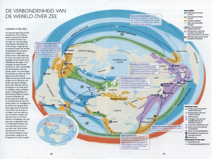 Het meest in het oog springend zijn de kaarten, alleen al daarvoor zou je Van savanne tot stad moeten openslaan. In het midden vind je 56 kaarten in kleur. Bekijk ze zorgvuldig, want ook hier is de informatiedichtheid hoog. De kaarten ondersteunen de tekst en zien er interessant en verrassend uit. De verbondenheid van de wereld over zee bijvoorbeeld, waarbij je vanuit een andere hoek dan voor ons gebruikelijk kijkt, toont de scheepvaartroutes van de Europeanen vanaf de 15e eeuw (figuur 2). De tekst bij de kaart opent met de zin ‘Overzee is ver weg’. Want als iets duidelijk wordt uit deze kaart, is het hoeveel tijd het kostte om bestemmingen overzee te bereiken. Enkel de enorme winstkansen brachten Europeanen zover. De as van de oude wereld aan het begin van onze jaartelling brengt de verbondenheid tussen samenlevingen duidelijk voor het voetlicht. Rond het jaar 200 woonde meer dan twee derde van de wereldbevolking in een strook tussen de Gele en de Oost-Chinese Zee aan de ene en de Middellandse Zee aan de andere kant. De twee belangrijkste mogendheden, het Han-rijk en het Romeinse Rijk, bevonden zich aan de uiteinden (figuur 3).