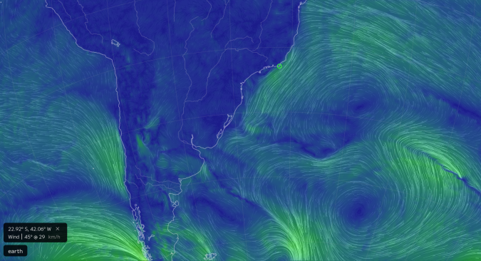 De Falklandstroom is duidelijk de enige koude zeestroom die in de buurt van Cabo Frio zou kunnen komen. Maar als je door de tijdlijn van de Nullschool-animatie (zie earth.nullschool.net) gaat, kom je eigenlijk geen situaties tegen waarin dat het geval is (figuur 1). Wel komt de stroom soms op wat lagere breedte (dus verder naar het noorden, dichter bij de evenaar) terecht, vooral in de wintermaanden op het zuidelijk halfrond (juni-september, niet in beeld). Dit verklaart echter niet waarom het water rond Cabo Frio eigenlijk altijd wel een paar graden kouder is dan de omringende oceaan. Hoe kan dat dan?