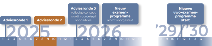 Voor de herziening van de examenprogramma’s is twee jaar uitgetrokken, met adviesrondes in januari-maart en in juli-oktober 2025. In de derde adviesronde in februari-april 2026 wordt het volledige concept voorgelegd voor advies. In juli 2026 wordt het nieuwe examenprogramma dan vastgesteld. De verwachting is dat de nieuwe examenprogramma’s starten in leerjaar 2029-2030. De eerste examens voor vmbo en havo volgen een jaar later.