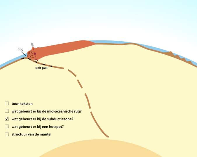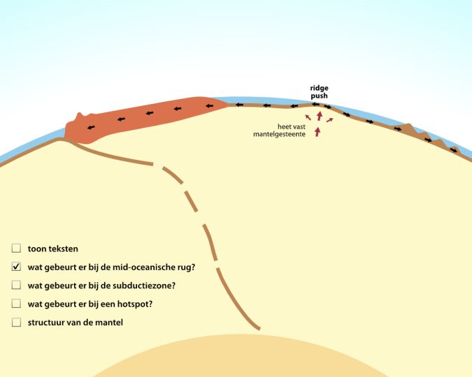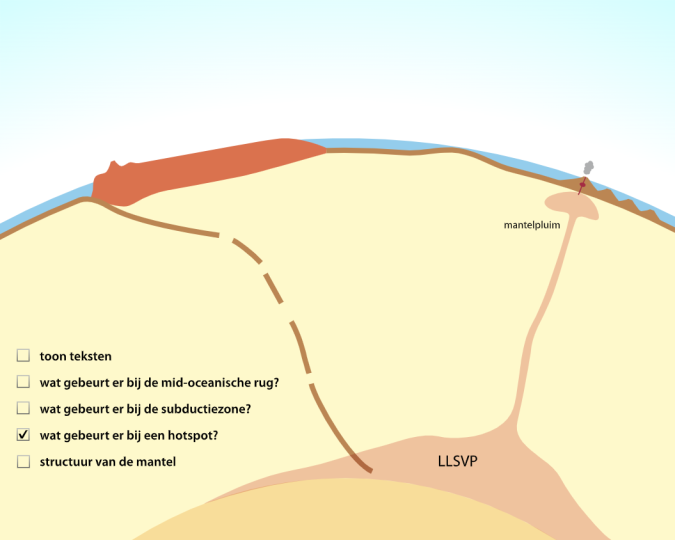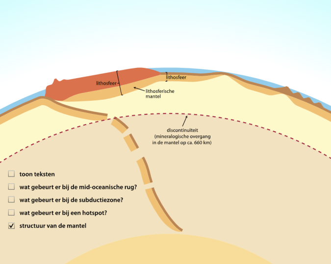 Het algemene beeld van de opbouw van korst en mantel is aan te vullen met meer gedetailleerde informatie. Gewoon een kwestie van aanvinken. Alles kan tegelijk aan, maar dan wordt de animatie erg druk en is het voor leerlingen moeilijk focussen op een onderdeel. Het is handig te beginnen met de optie ‘toon teksten’, maar deze uit te schakelen als je andere onderdelen aanvinkt. De ‘structuur van de mantel’ kan getoond blijven in combinatie met andere onderdelen. De overige drie – midoceanische rug, subductiezone en hotspot – kun je het best een voor een oproepen.