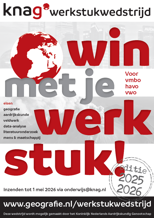 Heeft een van je leerlingen een geografisch aansprekend, creatief en relevant profielwerkstuk geschreven? Stuur dit dan voor 1 mei naar het KNAG. Misschien maakt jouw leerling kans op het predicaat Beste aardrijkskundige werkstuk 2025-2026. De wedstrijd staat open voor vwo, havo en vmbo/mavo.