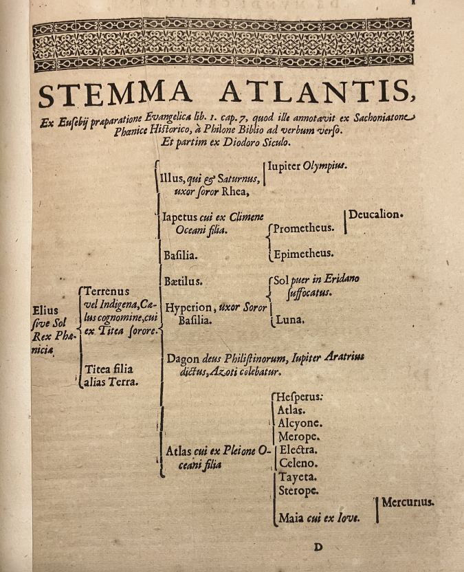 Mercator combineerde beide verhalen. Omdat Diodoros in het derde boek schreef dat Atlas de vader was van Hesperus en in het vierde boek dat Atlas de broer was van Hesperus, concludeerde Mercator dat er twee personen met de naam Atlas waren, vader en zoon. Hij voegde zelfs een genealogisch schema toe (figuur 4).