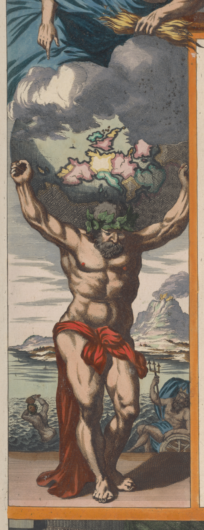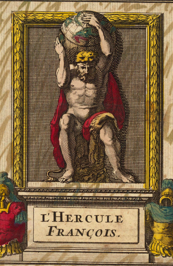 In Frankrijk zetten graveurs niet Atlas, maar Hercules op titelpagina’s. Hercules, die slechts een kort moment de hemel gedragen heeft, onderscheidt zich van Atlas door de leeuwenhuid die hij draagt. Hercules onderging hetzelfde lot als Atlas: hij kreeg ook de aardbol te dragen. In 1681 staat de aardedragende Hercules op de titelpagina van de Atlas Nouveau. Het onderschrift L’Hercule François laat er geen twijfel over bestaan dat het Hercules betreft (figuur 10). Een exacte kopie van Jaillots atlas verscheen in 1692 bij Pieter Mortier, waarmee de aardedragende Hercules zijn intrede deed in Nederland. Mortier plaatste ook in het gegraveerde kader van de inhoudsopgave voor deze atlas een hemeldragende figuur. Deze draagt geen leeuwenhuid en mogelijk wordt hier wel weer Atlas bedoeld (figuur 11).