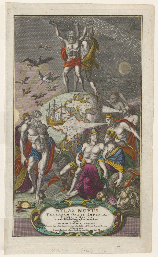 De Duitse uitgever Johann Baptist Homann kon kennelijk niet kiezen of hij Atlas of Hercules op zijn titelpagina de hemel zou laten dragen en beeldde ze allebei af (figuur 3).