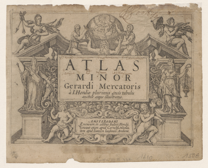 Ook op de titelpagina van Hondius’ Atlas Minor uit 1607 staat een aardedragende man (figuur 6).