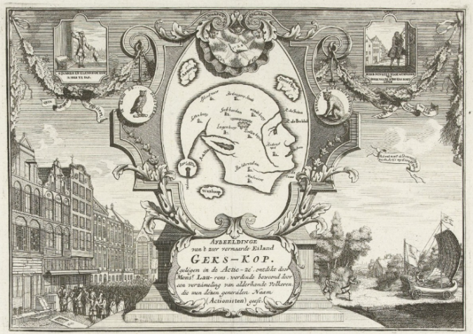 In een historisch overzicht van de cartografie van geld wordt bijvoorbeeld aandacht besteed aan The Great Mirror of Folly, een in 1720 in Amsterdam verschenen boek met fantasiekaarten, waaronder die van Geks-Kop: een fantasie-eiland in de vorm van het hoofd van een nar. De Seine vormt de rand van zijn muts (figuur 2). Op de plek waar je zijn brein verwacht, staat Quinqempoix, de naam van een Parijse straat waar speculanten aandelen in de Mississippi Company verhandelden. De Mississippi Company was een monopolistische handelsmaatschappij in aandelen in de Franse koloniën in Noord-Amerika en West-Indië. In 1719 stegen de aandelenkoersen door deze handel tot stratosferische hoogten om een jaar later volledig in te storten. Het eiland bevat plaatsnamen als Bedriegers Stadt en de kleine eilandjes voor de kust heten Wanhoop, Armoed en Droefhyt. Een satirische kijk op een vroeg voorbeeld van bloei en krimp in de financiële geschiedenis.