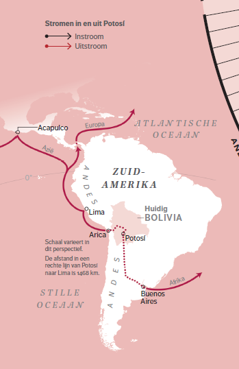 De atlas bestrijkt een breed scala onderwerpen, verspreid in zowel tijd als ruimte. Neem de vondst in 1545 van een zilverlaag in Potosí (Bolivia) door mijnwerker Diego Gualpa. De Cerro rico (Rijke piek) produceerde al snel de helft van al het zilver in de wereld en Potosí werd de grootste stad van Amerika. Het zilver uit Potosí maakte van de Spaanse real de eerste mondiale munteenheid. De winning van het zilver geschiedde evenwel tegen onvoorstelbare menselijke en ecologische kosten. Vele van oorspronkelijke bewoners die door de Spanjaarden gedwongen werden in de mijnen te werken, stierven jong en de introductie van kwik om het zilver te zuiveren, veroorzaakte een dodelijke vervuiling van water, lucht en bodem. Terwijl zich in Potosí een humanitair drama afspeelde, ontstond daar – in een van de meest geïsoleerde steden van de wereld – voor het eerst iets wat je mondialisering zou kunnen noemen. Via handelsroute vanuit Azië via Manilla en Macau vonden luxegoederen zoals porselein, ivoor, parfum en tapijten hun weg naar Potosí. De trans-Atlantische handelsroute verbond de stad met Sevilla (Europa) en Luanda (Afrika). Naar Spanje ging in de eerste plaats het zilver. Uit Spanje kwamen geestelijken en bestuurders en uit Afrika arriveerden tot slaaf gemaakten (figuur 3).