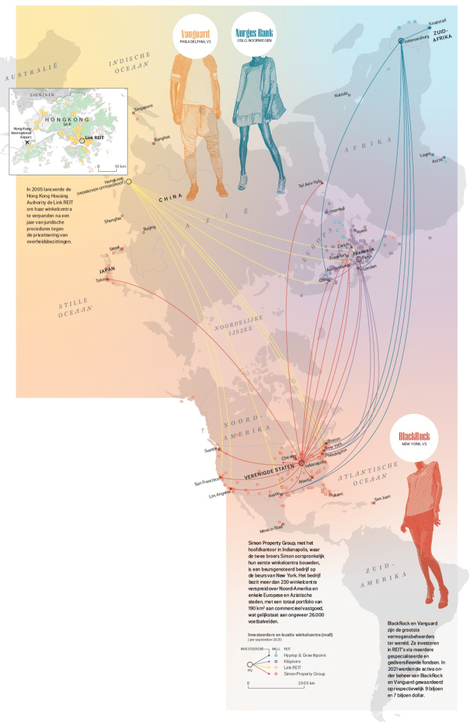 De wereldwijde verwevenheid van economische activiteiten en financiële stromen is al eeuwen veel complexer dan we ons realiseren. Dat het geld dat we in een winkelketen uitgeven, niet ten goede komt aan lokale verkopers is duidelijk. Maar slechts weinigen hebben besef van de wereldwijde financiële structuren die uiteindelijk leiden tot kapitaalaccumulatie in slechts een beperkt aantal locaties. In de atlas wordt dat als volgt verwoord: ‘Mensen gaan naar een winkelcentrum om dingen te kopen of om er gewoon met vrienden rond te hangen. Ondertussen kopen sommige investeerders de winkelcentra zelf.’ Dat gebeurt door real estate investment trusts (REIT’s) over de hele wereld. Simon Property Group heerst in de Verenigde Staten, Korea en Japan; Klépierre heeft de Europese markt in handen; Link bezit vooral veel winkelcentra in Azië; en Growthpoint en Hyprop hebben netwerken in Afrika en Oost-Europa. Via ingenieuze netwerken belandt de winst van iedere peso die in een Mexicaans winkelcentrum wordt uitgegeven via Indianapolis in Oslo. En verdwijnt de winst op iedere Ghanese cedi uitgegeven in een winkelcentrum in Accra, via Johannesburg naar New York. En de winst op euro’s die wij in Amsterdam hebben uitgegeven, komt terecht in Indianapolis (figuur 4).