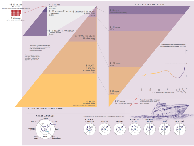Waar het gros van de mensen wereldwijd het eigen vermogen tussen 1995-2021 met 3 à 4% per jaar zag toenemen, werd de rijkste 1% van de wereld maar liefst 9,3% rijker. De meest vermogende 1% heeft daarmee in 25 jaar 38% van alle extra wereldwijde rijkdom verzameld. De rijkste 166 mensen op aarde bezitten samen meer vermogen dan de armste 50% van de wereldbevolking (figuur 5). Dat zijn bijna 3 miljard mensen. Nivellering mag gevoelig liggen in de Nederlandse politiek, maar mondiaal zal deze noodzakelijk zijn om het economisch systeem draaiend te houden. ‘Om de groeiende ongelijkheid aan te pakken, is meer belasting nodig voor degenen met de meeste rijkdom en de hoogste inkomens, herverdeling van rijkdom en het aanpakken van belastingontduiking en -ontwijking via belastingparadijzen’, aldus de auteurs. In sommige commentaren op de atlas wordt de redactie dan ook verweten dat deze linkse sympathieën zou hebben – op de cover van de Nederlandse uitgave is Karl Marx opvallend genoeg verdwenen. Maar deze ‘linkse’ woorden komen wel uit de mond van specialisten op het gebied van geld en financiën. Onderwerpen die vaak toch als meer ‘rechts’ worden gezien.