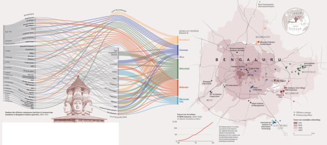 Neem de Indiase stad Bengaluru. Deze fungeert momenteel als IT-centrum in een mondiaal financieel netwerk. Dankzij de razendsnelle ontwikkelingen in de informatietechnologie konden banken de afgelopen decennia hele bedrijfstakken verplaatsen naar buitenlandse steden waar onroerend goed en arbeid goedkoper zijn, het zogenoemde offshoring. Tegelijkertijd besteedden banken steeds meer kerntaken zoals gegevensanalyse en klantenbeheer uit aan externe leveranciers. Deze twee ontwikkelingen samen maakten dat Bengaluru nu een mondiale speler is in de financiële wereld. In 1993 opende in Bengaluru een bedrijf dat via internet bankdiensten verzorgde. Onder de naam Finacle bedient het tegenwoordig meer dan een miljard individuele klanten. Maar het bleef niet bij dit ene bedrijf. Vanuit de financiële sector steeg de vraag naar informatietechnologie en digitale processen. Bengaluru was goedkoop als vestigingsplaats en er was kennis aanwezig. In dertig jaar groeide de stad uit tot de wereldhoofdstad van de outsourcing- en offshorenetwerken. Of het nu gaat om het Nederlandse ING of om de Bank of Australia. Hun digitale processen laten ze uitvoeren in een van de zes techparken rond Bengaluru. De atlas toont hoe de stad de afgelopen drie decennia uitdijde, met campussen en techparken aan de stadsrand. Een kaart over de volle breedte laat zien hoe 32 banken uit de Verenigde Staten, Europa en Oceanië hier momenteel diensten laten uitvoeren door 11 offshorebedrijven (figuur 1). Van een stip op de kaart van India veranderde Bengaluru hierdoor binnen enkele decennia in het Silicon Valley van India.